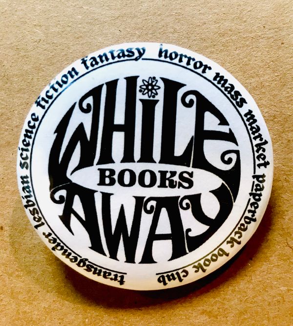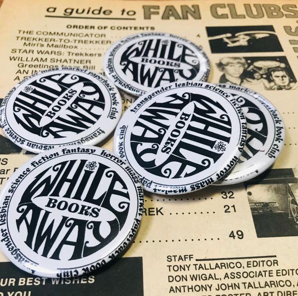 2.25" pinback button that reads "transgender lesbian science fiction fantasy horror mass market paperback book club"