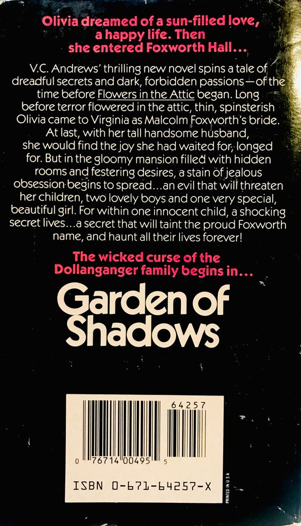 V.C. Andrews' thrilling new novel spins a tale of dreadful secrets and dark, forbidden passions-of the time before Flowers in the Attic began. Long before terror flowered in the attic, thin, spinsterish Olivia came to Virginia as Malcolm Foxworth's bride. At last, with her tall handsome husband,