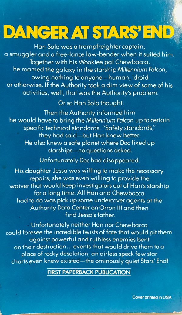 a smuggler and a free-lance law-bender when it suited him. Together with his Wookiee pal Chewbacca, he roamed the galaxy in the starship Millennium Falcon, owing nothing to anyone-human, 'droid or otherwise. If the Authority took a dim view of some of his activities, well, that was the Authority's problem. Or so Han Solo thought.