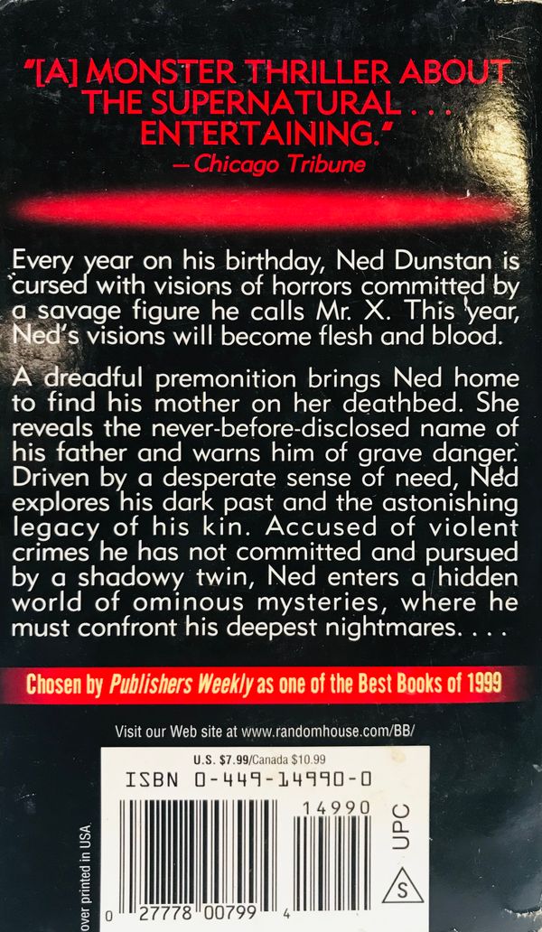 A dreadful premonition brings Ned home to find his mother on her deathbed. She reveals the never-before-disclosed name of his father and warns him of grave danger. Driven by a desperate sense of need, Ned explores his dark past and the astonishing legacy of his kin. Accused of violent crimes he has not committed and pursued by a shadowy twin, Ned enters a hidden world of ominous mysteries, where he must confront his deepest nightmares. . . .