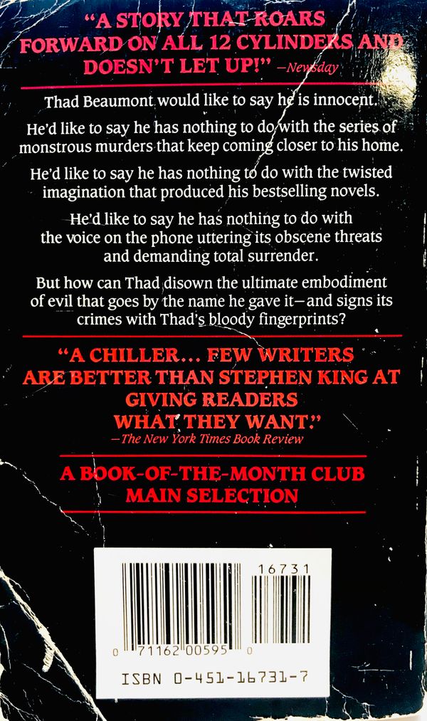 Thad Beaumont would like to say he is innocent. He'd like to say he has nothing to do with the series of monstrous murders that keep coming closer to his home. He'd like to say he has nothing to do with the twisted imagination that produced his bestselling novels.