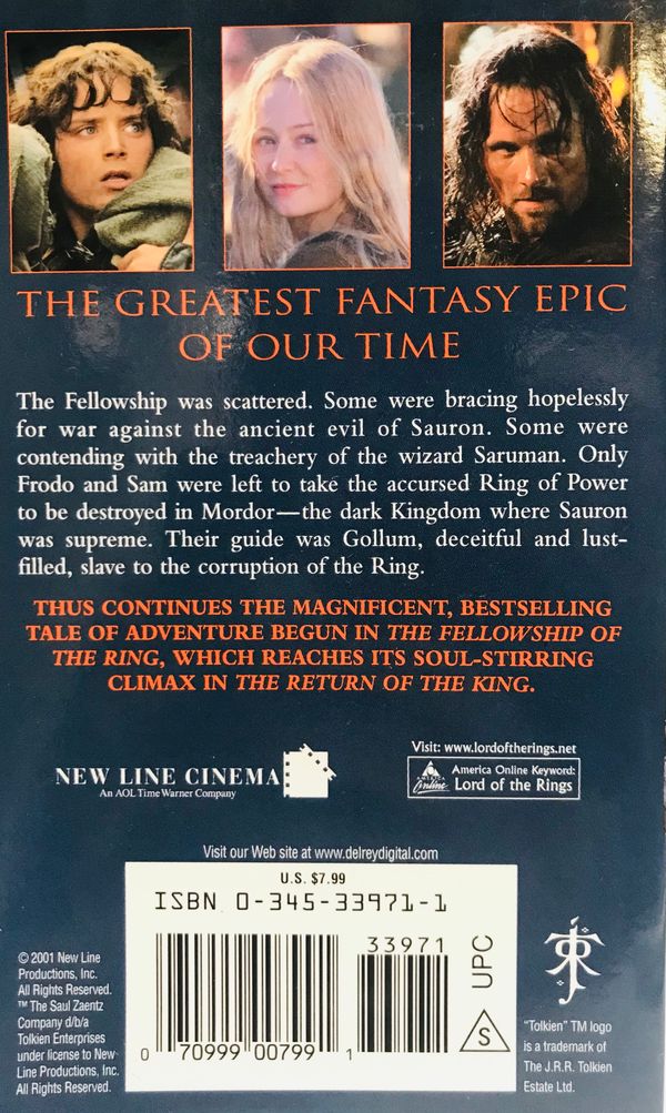 THUS CONTINUES THE MAGNIFICENT, BESTSELLING TALE OF ADVENTURE BEGUN IN THE FELLOWSHIP OF THE RING, WHICH REACHES ITS SOUL-STIRRING CLIMAX IN THE RETURN OF THE KING.
